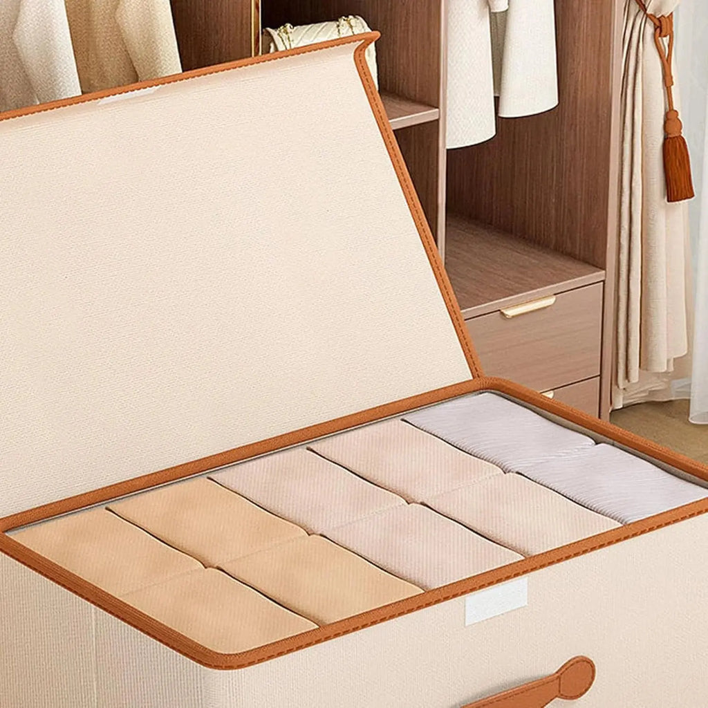 Transform your home organization with our versatile 2-in-1 Foldable Wardrobe Storage Box with Lid | Clothes Organizer, the ultimate solution for a clutter-free space. This elegant and functional clothes organizer storage bin is designed to meet all your needs, from neatly tucking away winter comforters to sorting everyday essentials. Crafted from durable, moisture-resistant Oxford fabric with a modern beige finish, this sleek storage solution adds a touch of style to any room. What makes our box stand out is its innovative design. A sturdy internal steel frame allows you to stack multiple boxes, maximizing vertical space in your closet, while the convenient faux leather handles make it easy to carry. The "2-in-1" feature includes a removable divider, allowing you to create two separate compartments for organizing items like pants, jeans, and underwear, or remove it to create a single, spacious bin for larger items. When not in use, the box effortlessly folds flat, making it a perfect under-bed storage option.