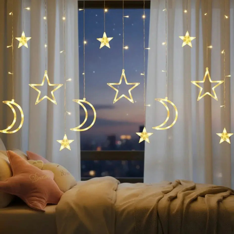 Enchanting Glow: Create a mesmerizing ambiance with soft, warm LED curtain lights featuring elegant moon and star motifs, perfect for adding a magical touch to any space.
