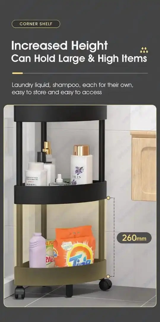 احصل على أقصى استفادة من المساحة باستخدام هذا الرف الزاوي متعدد الاستخدامات. يوفر تصميمه المعدني الأنيق وطبقاته المتعددة مساحة تخزين واسعة للحمامات أو المطابخ أو أي زاوية. يتضمن عجلات لسهولة الحركة ورف مرحاض قابل للسحب لمزيد من الراحة.