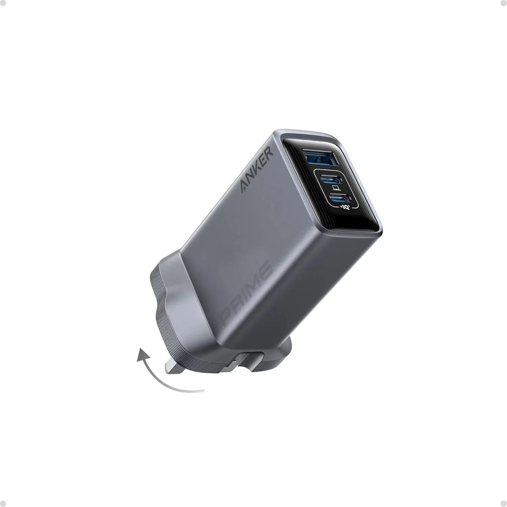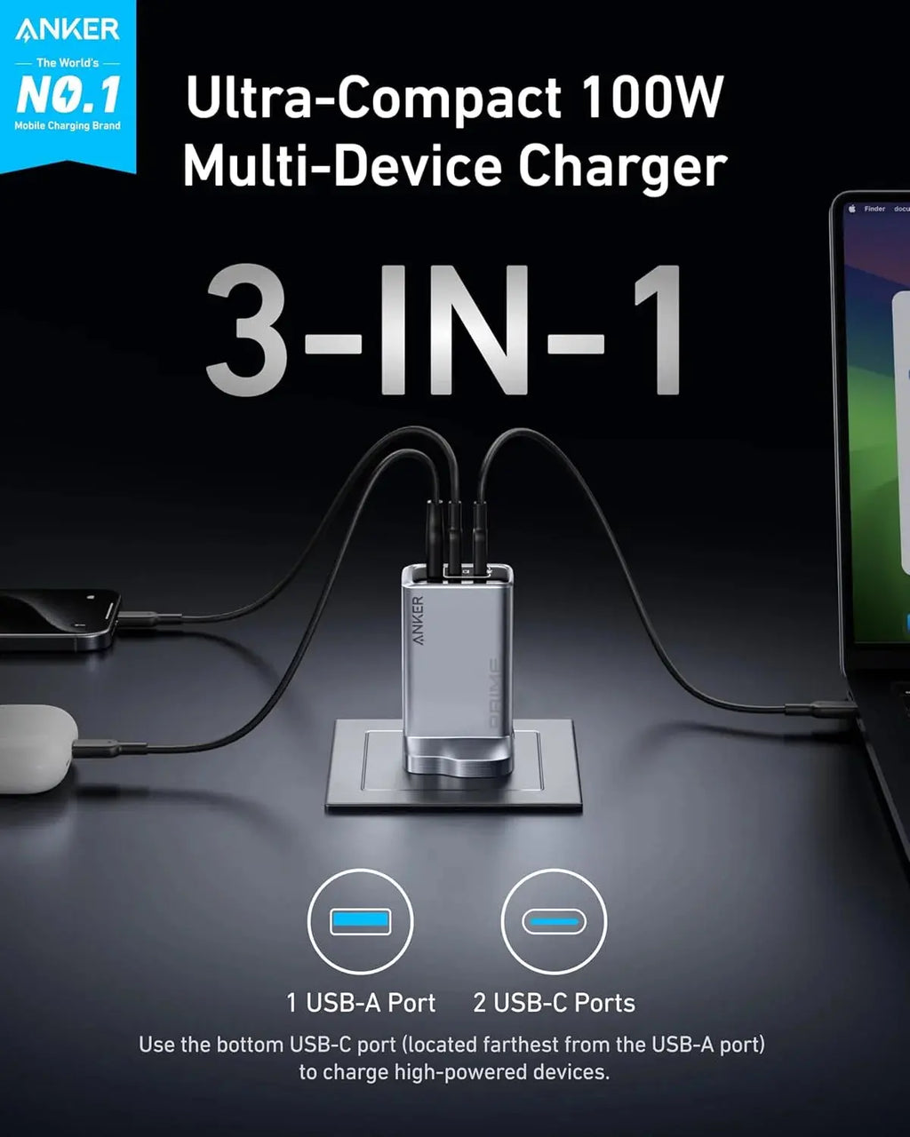The Anker Prime 100W 3-Port Multi-Device Charger is the ultimate fast-charging solution for laptops, tablets, smartphones and multiple gadgets at once. Powered by GaN technology and Power Delivery (PD), it delivers ultra-high speed charging with 2×USB-C and 1×USB-A ports, enabling simultaneous charging without losing power. The foldable UK plug makes it perfect for home, travel and office use in Doha Qatar. Designed for safety and performance, it includes Anker MultiProtect system for temperature control, overload protection and device safety — ideal for work, gaming, study or daily charging needs.