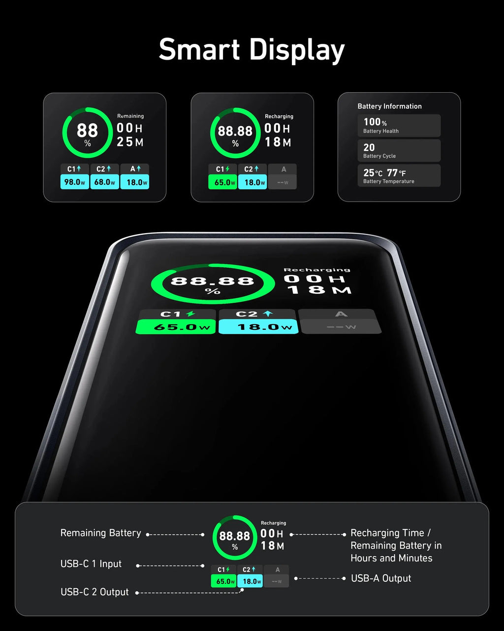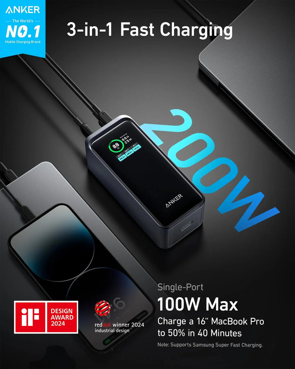 Stay powered anywhere with the Anker Prime Power Bank (20,000mAh, 200W) — the perfect fast-charging companion for travel, work, and daily use in Doha Qatar. Engineered with Power Delivery 3.0 and ActiveShield™ 2.0 enhanced safety, it delivers maximum charging speed while protecting your devices. The 200W total output powers laptops, tablets, and smartphones simultaneously, making it the ideal backup battery for business, gaming, and creators on the move. Charge a 16" MacBook Pro to 50% in only 40 minutes, or get 3+ full phone recharges from the massive 20,000mAh battery. With 100W high-speed recharging, the power bank gets fully charged quickly, ensuring uninterrupted usage for travel, holidays, office, and emergencies in Qatar. The real-time LED smart display shows power distribution, input/output wattage, and remaining capacity. Whether you’re charging an iPhone, Samsung Galaxy, iPad, MacBook, Nintendo Switch, Steam Deck, DJI drone, or earbuds, this power bank guarantees reliable top-tier performance anywhere in Qatar. Ideal for anyone searching for best fast charging power bank Qatar / PD 200W power bank Doha / MacBook power bank with USB-C fast charging.