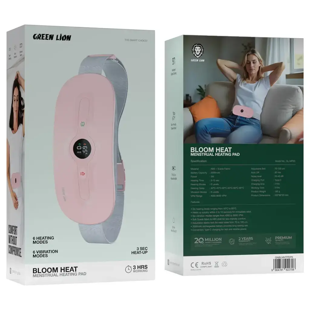 Experience gentle, effective, and discreet menstrual pain relief with the Green Lion Bloom Heat Menstrual Heating Pad – Pink, designed for women who want comfort, mobility, and fast results in Doha, Qatar. This advanced heating pad combines rapid heat therapy and vibration massage to ease cramps, lower back pain, and abdominal discomfort naturally—without medication. Powered by a 2000mAh rechargeable battery, the Bloom Heat Pad heats up in just 3–10 seconds and offers 6 adjustable heat levels (40°C–65°C) to suit individual comfort needs. With 6 vibration modes (4000–8000 VPM), it enhances blood circulation and relaxes muscles for deeper relief. The skin-friendly suede fabric ensures softness against the body, while the abrasion-resistant ABS casing guarantees durability. Its adjustable belt (70–120cm) provides a secure and customized fit, making it ideal for use at home, work, or while traveling across Qatar. Featuring a digital display, Type-C fast charging, silent operation, and a 30-minute auto shut-off, this heating pad delivers safe, modern, and stress-free pain management.