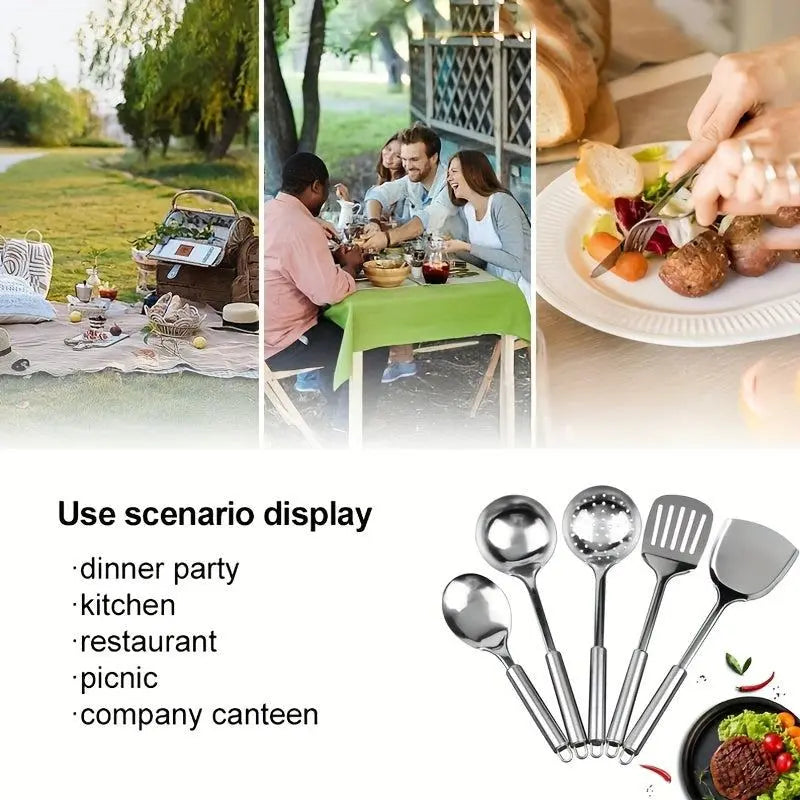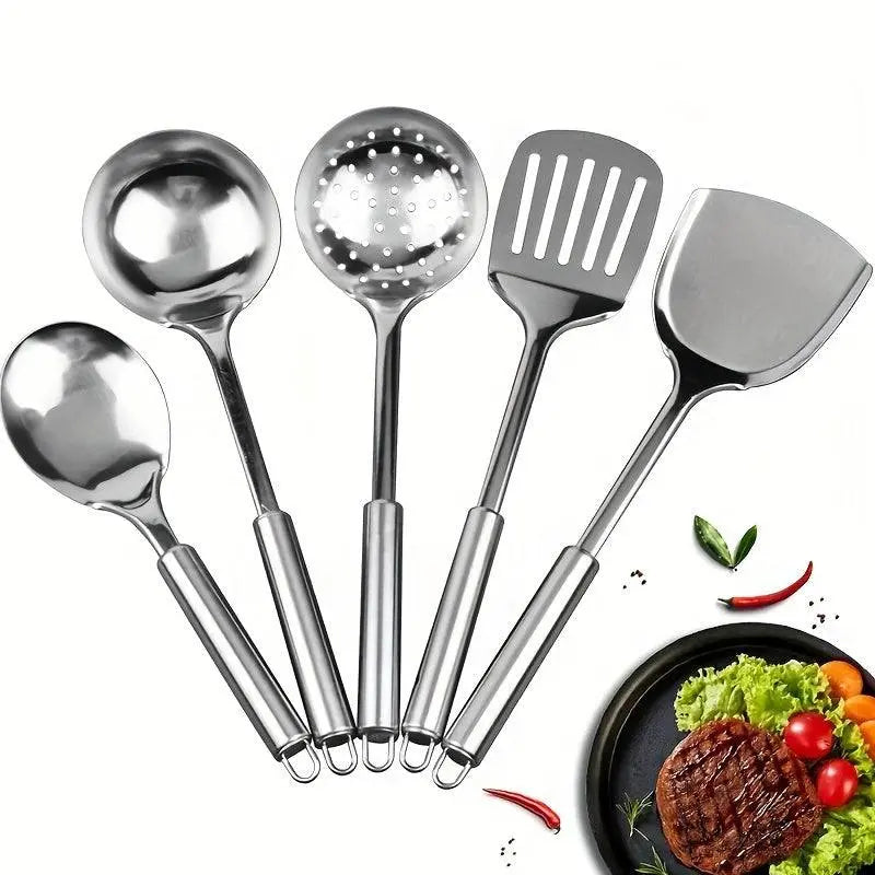 مجموعة أدوات المطبخ مكونة من 5 قطع: ملعقة طهي سميكة من الفولاذ المقاوم للصدأ، وملعقة حساء، ومصفاة، ومجرفة وعاء، ومجرفة قلي