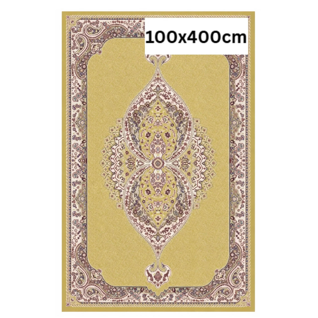 Designed for homes in Doha, Qatar, this 100×400 cm Persian-style runner carpet is perfect for hallways, corridors, majlis entrances, and long living spaces. People buy this rug to protect floors, reduce noise, and elevate interior décor with a timeless traditional look. The elegant gold and floral medallion pattern adds warmth and luxury while remaining practical for daily use in high-traffic areas. Ideal for apartments, villas, offices, and prayer corridors across Qatar.