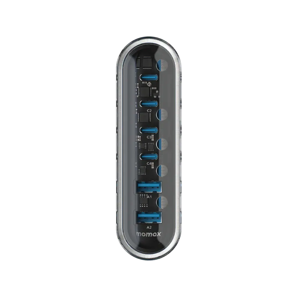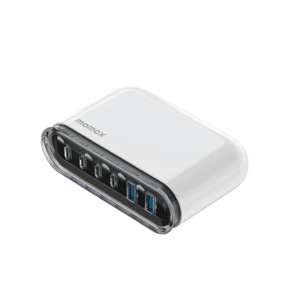 Take control of your power needs with the MOMAX 1-Charger Flow Plus 120W Desktop Charger — your all-in-one charging solution for home, office, or tech-heavy workstations. This 6-port powerhouse charges phones, tablets, laptops, and even MacBooks all at once, saving time and eliminating cable clutter. Powered by advanced GaN technology, it offers faster, cooler, and more energy-efficient charging than traditional chargers. The transparent design and sleek stainless steel stand not only perform well but elevate your workspace with modern style. Whether you're a homemaker managing family devices, a busy couple sharing tech, or a remote-working IT pro, this charger keeps all your devices running – effortlessly.