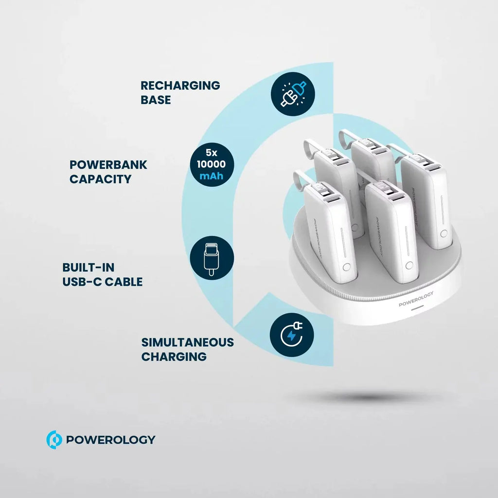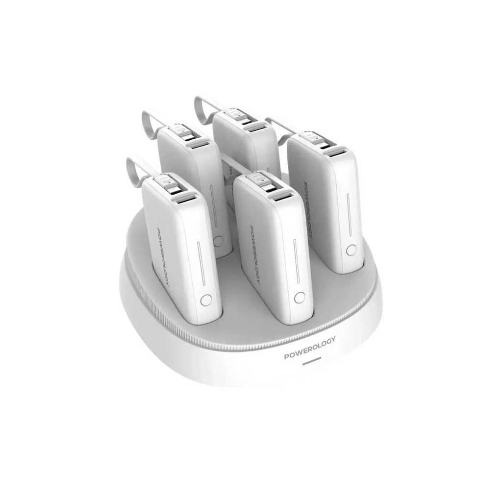 Stay powered anywhere in Doha, Qatar with the Powerology 5-in-1 10000mAh Power Bank Station, designed for people who need reliable, fast, and multi-device charging every day. This compact yet powerful charging solution includes five high-density 10000mAh power banks, making it ideal for homes, offices, shops, hotels, and travel use. Equipped with 50W Power Delivery, Quick Charge (QC) support, USB-A and USB-C outputs, and a built-in Type-C cable, this station ensures fast and efficient charging for smartphones, tablets, wireless earbuds, and other USB devices. The rapid recharging station with 12V/1A contact input allows quick power restoration, so your devices are always ready. Built with advanced safety safeguards, the Powerology 5-in-1 power bank station protects against overcharging, overheating, and short circuits. Its modern white finish blends style with performance, making it a smart charging solution for both personal and professional use in Qatar.