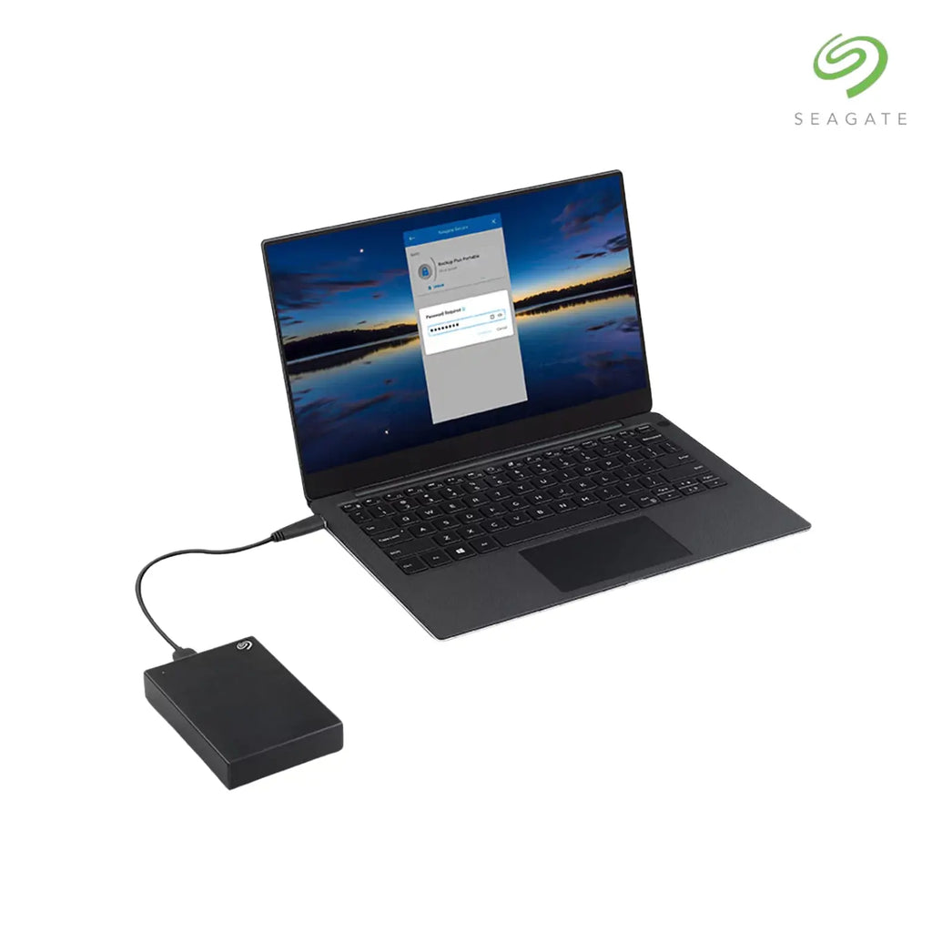 5 TB of digital storage capacity is available on this Seagate portable hard disk With Password, which interfaces with USB 3.0 technology for connectivity. It has a 2.5 inch form factor and is compatible with laptops. The installation involves simply plugging it in, and it comes in a sleek black color.