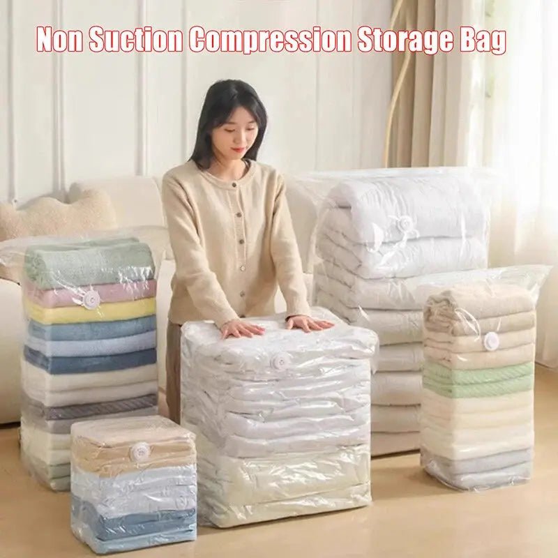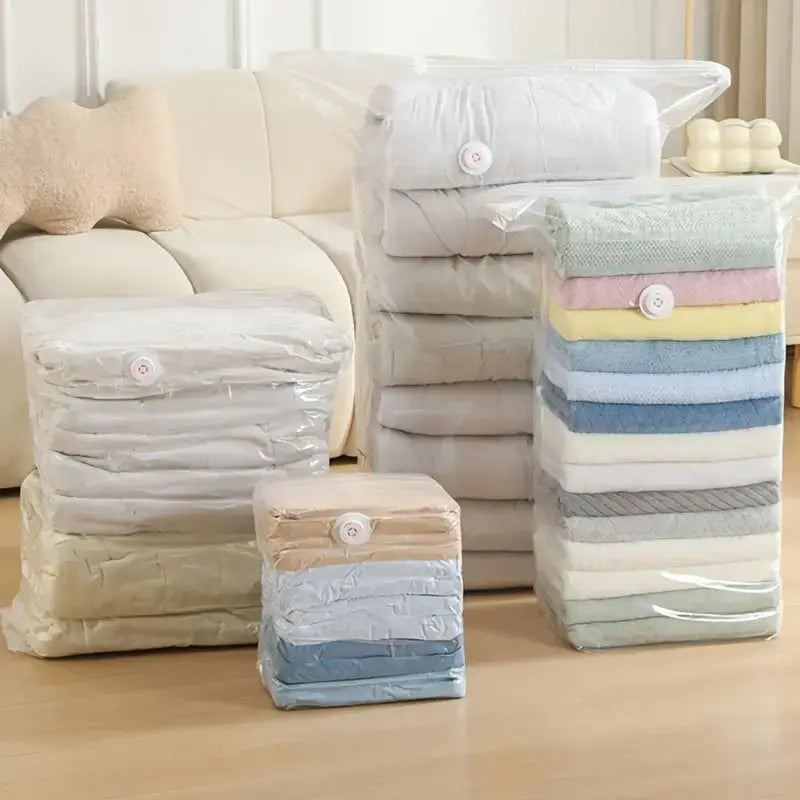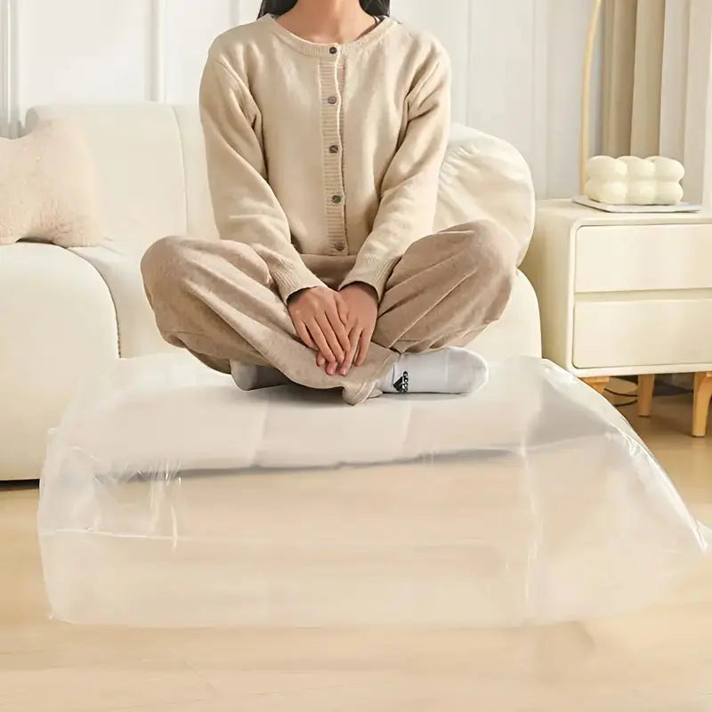 Reclaim your valuable space with our premium Space-Saving Vacuum Storage Bags for Quilts & Blankets, the ultimate Sleek Storage Solution for your home. Designed specifically for bulky items like quilts, blankets, comforters, pillows, and seasonal clothing, these bags compress your items to a fraction of their original size, saving up to 80% of storage space. The lightweight and foldable design makes them an essential tool for Home Organization and a must-have for travel. Crafted from a durable and flexible blend of PA and PE plastic, these vacuum sealed bags are waterproof, airtight, and resistant to tears and punctures, providing a secure closure that protects your stored items from moisture, dust, and odors. The universal valve is compatible with any standard vacuum cleaner hose, making compression quick and easy. Simply pack your items, seal the bag with the premium double-zip closure, and remove the air to create a compact, sealed package. From organizing your closets and drawers to packing for a move, these bags are your key to a tidy and clutter-free life.