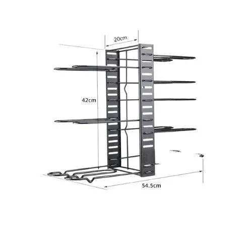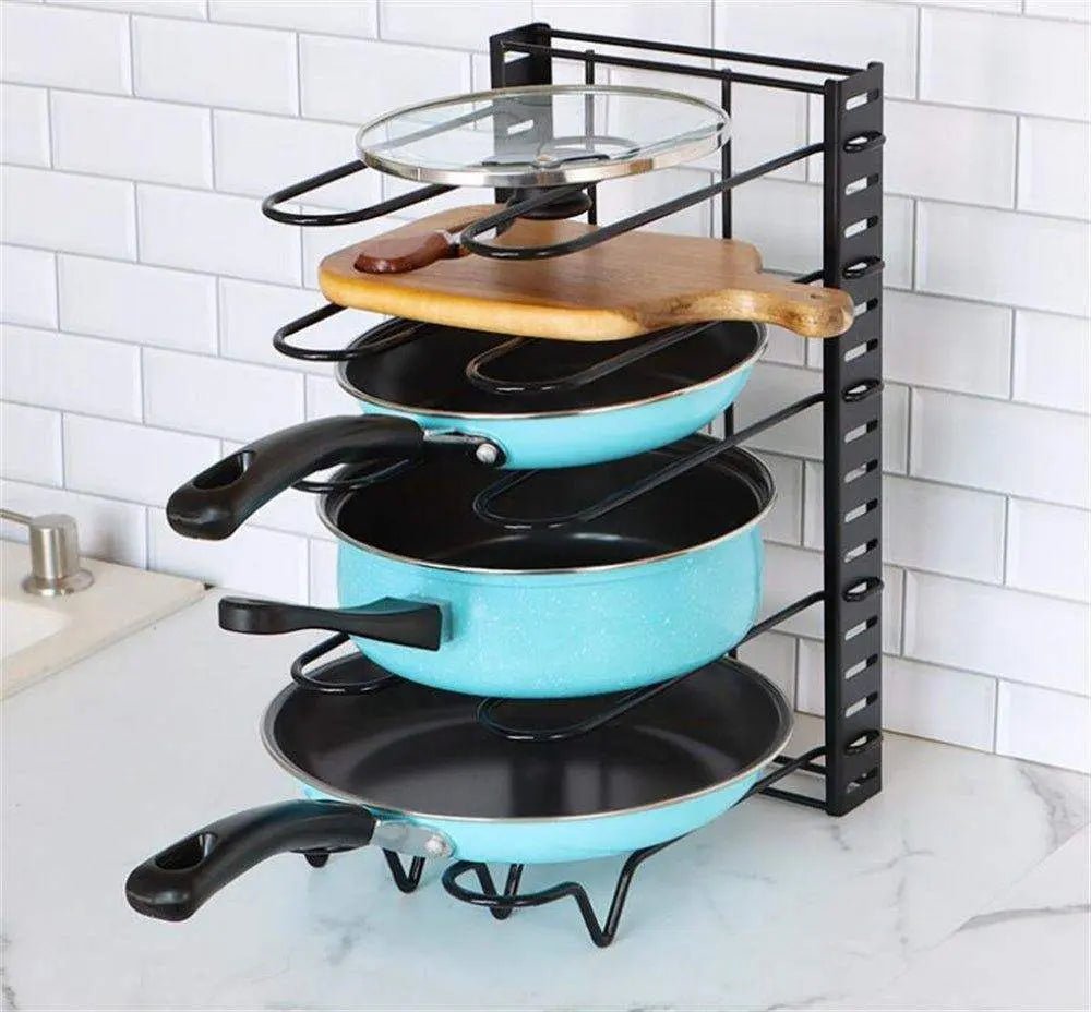 ADJUSTABLE TIERS 💯 :This pan rack organizer comes with 8 adjustable tiers, you can install the pan organizer according to the size of your pots and pans. No matter how big your pot is, it can still fit into your pot organizer. Help you more convenient to organize kitchen storage.
