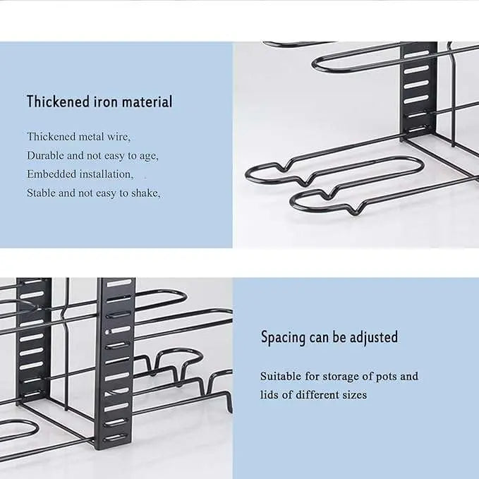 SOLID CONSTRUCTION 💯: This cookware kitchen organizer made by heavy duty iron with black spray painting. It’ s Very Firm and Elegant. Solid Triangular design which is more stable and less likely to fall. Black spray painting makes pot lid rack not easy to rust.