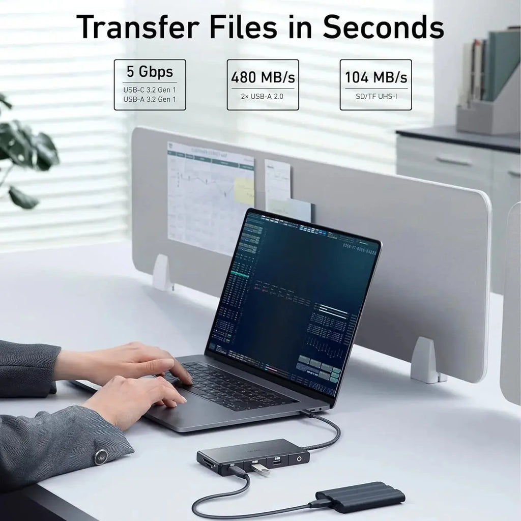 Features: 9-in-1 connectivity, 4K HDMI output, ultra-fast file transfer, USB-C pass-through charging