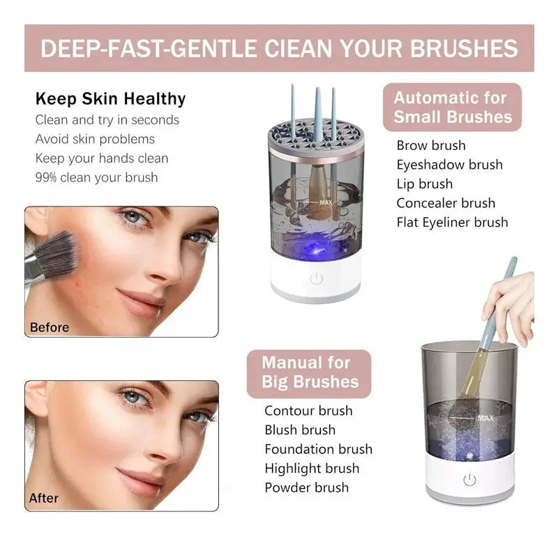 Simplify your beauty routine and protect your skin with the Automatic Electric Portable Makeup Brush Cleaner Machine, an elegant and efficient solution for deep-cleaning your cosmetic brushes. This innovative device combines a new, top-quality design with sonic low-vibration technology to effortlessly remove cosmetics, dirt, oil, and other impurities without damaging delicate brush bristles. Say goodbye to the tedious mess of hand cleaning; in just a few minutes, this machine achieves up to 98% cleanliness, ensuring your brushes remain soft, nice, and long-lasting. The cleaner offers two convenient modes: an automatic mode to deep-clean multiple brushes simultaneously, and a hand-held cleaning mode using the included silicone mat for more targeted scrubbing of individual brushes. The Automatic Electric Portable Makeup Brush Cleaner Machine Designed for practicality, it is USB rechargeable for easy operation and portability, with a single button for control. A critical feature for its high performance is the 5V2A power requirement, which ensures the machine works at its optimal power for a thorough clean. It is compatible with most brushes on the market, making it a versatile tool for any beauty enthusiast. The package includes a silicone mat, a USB charging cable, and a user manual, providing everything you need to improve your makeup experience and promote healthier, more beautiful skin.