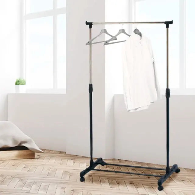 Introducing the Cloth Stand SIROCCO by MPG 209600. Featuring a strong single pole made of stainless steel and plastic, this cloth stand is both sturdy and easy to move on its wheels. Hang your clothing with ease and organization.