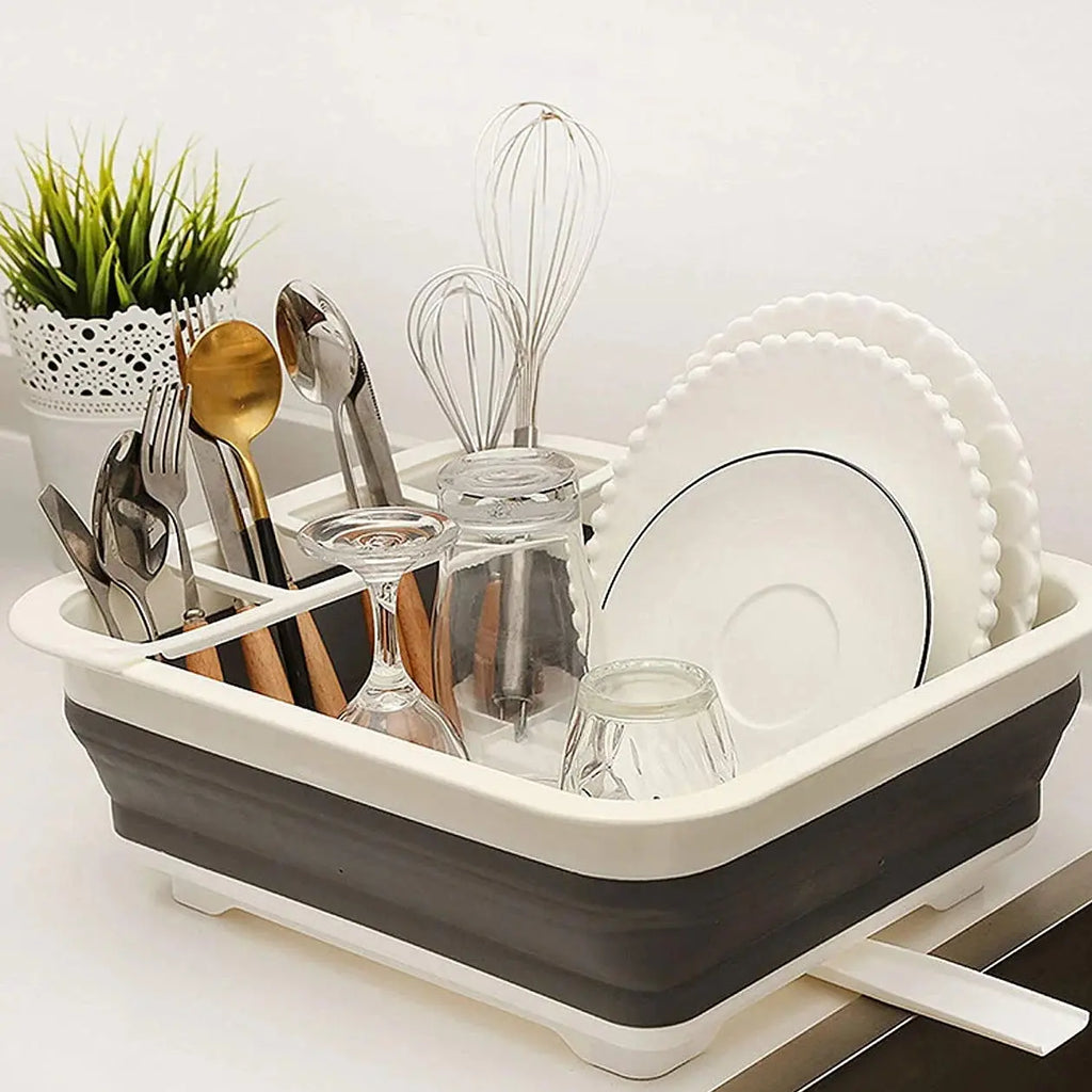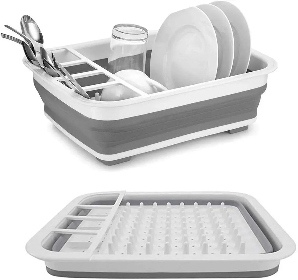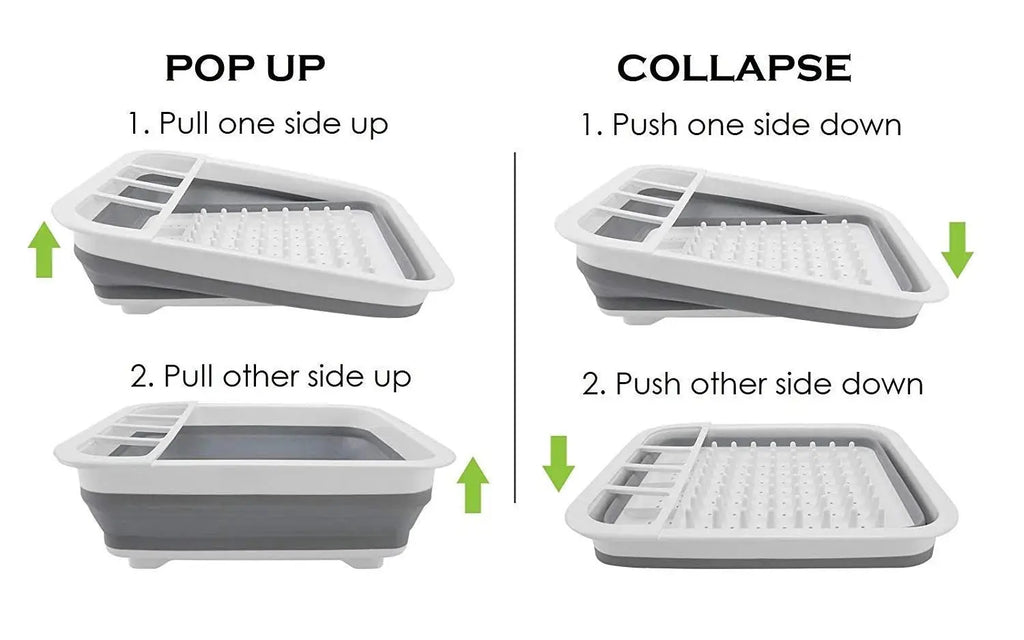 Collapsible dish drying rack designed to make kitchen organization easier while saving valuable counter space. This collapsible dish drying rack solves the common problem of bulky dish racks by offering a foldable and compact solution that can be stored effortlessly when not in use. Made from durable ABS plastic and flexible silicone (PP + TPE), this rack combines strength with flexibility. It pops up instantly when needed and collapses flat for convenient storage under the sink or inside cabinets. Whether you are managing a small kitchen or need a portable option for travel, this collapsible dish drying rack provides both functionality and convenience. Unlike traditional metal racks that rust and take up permanent space, this collapsible dish drying rack is designed for modern lifestyles. It features a smart drain board system with an adjustable swivel spout that directs water straight into the sink, keeping your countertops clean and dry. Its lightweight and portable design make it ideal for camping, RV trips, or temporary kitchen setups. The sturdy construction ensures it holds multiple dishes securely without bending or losing shape.