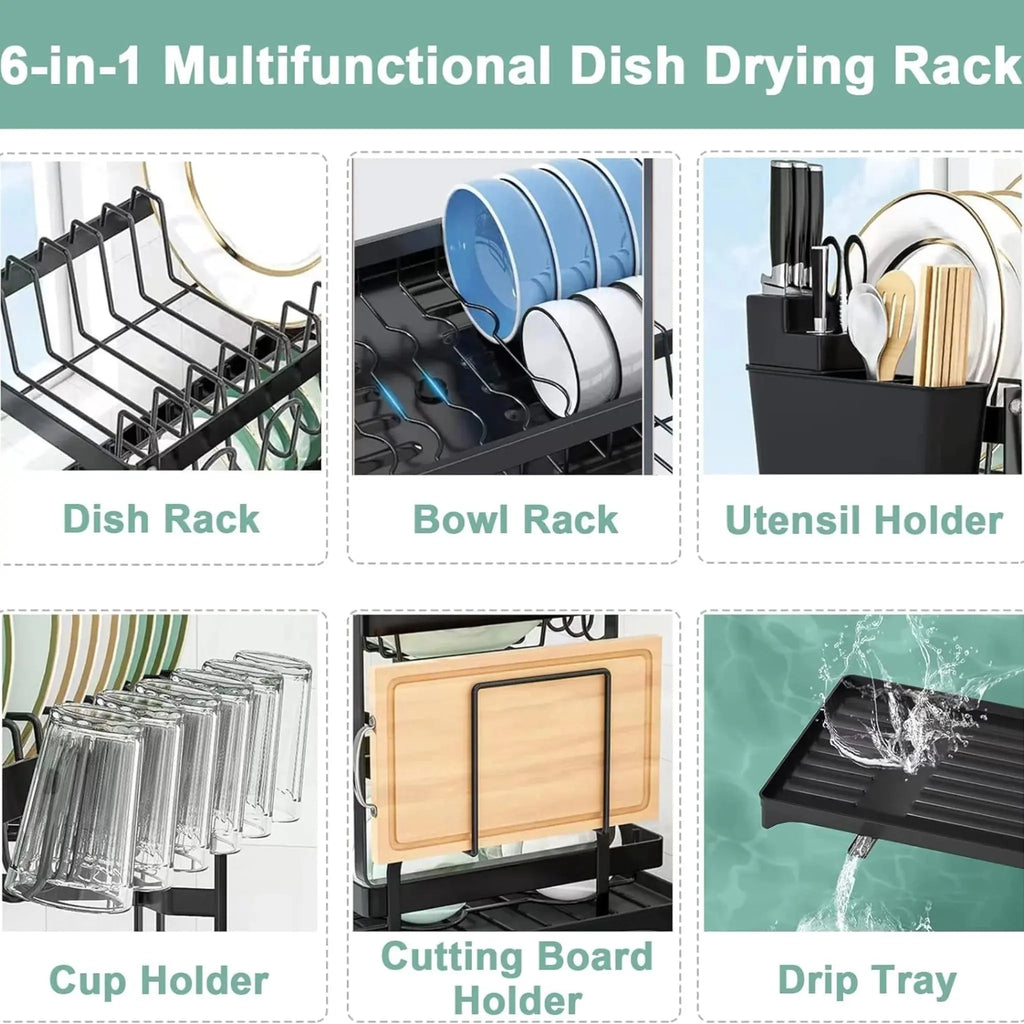 Upgrade your kitchen organization with this Double Layer Countertop Dish Drying Rack, designed to keep your dishes, cups, and cutlery neatly arranged while drying efficiently. Made from high-quality carbon steel and durable plastic, this rack combines stability, style, and functionality — perfect for modern kitchens with limited counter space. The two-tier structure provides ample storage space for plates, bowls, mugs, and utensils. The upper rack is ideal for dishes and larger cookware, while the bottom tray holds cups and smaller items. A detachable cutlery holder and side cup rack help organize your utensils for quick access and faster drying. Equipped with a removable drainboard, it ensures that excess water flows out easily, keeping your countertop clean and dry. With its sleek, rust-resistant finish, this dish rack not only enhances kitchen functionality but also adds a touch of elegance to your workspace.