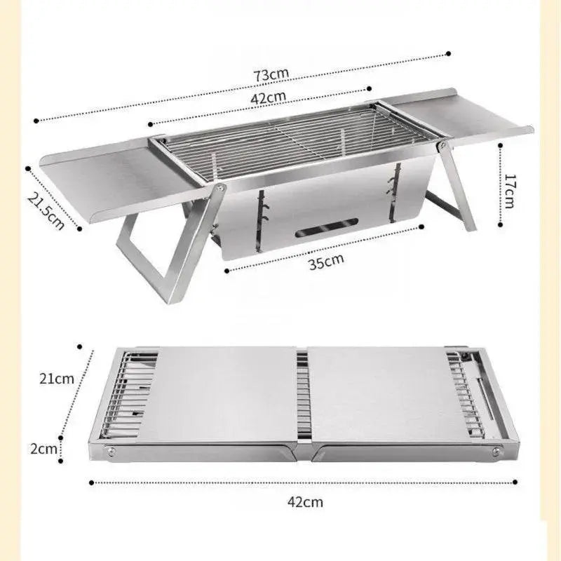 Discover the Foldable Outdoor BBQ Silver Notebook Charcoal Grill, made with modern design and high-quality craftsmanship. This portable charcoal grill is perfect for picnics, outdoor adventures, backyard parties, and beach barbecues. Made from durable high-heat-resistant, anti-rust steel, it folds instantly for easy storage and portability. Serves 5-9 people, it includes a BBQ and carbon net with storage rack, making up the complete grilling experience.