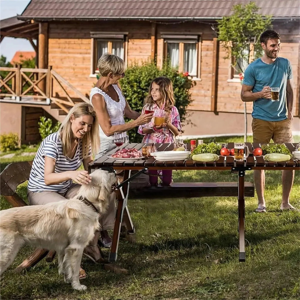 Enjoy every outdoor moment with the Folding Bamboo Camping Table, a perfect blend of natural beauty, durability, and portability. Built from 100% solid bamboo, this eco-friendly table is smooth, burr-free, and strong enough to support up to 50kg. Its PU-coated waterproof surface ensures long-lasting use while being easy to clean — simply wipe it down after every adventure. Designed for ultimate convenience, the foldable and roll-up tabletop and collapsible frame allow quick setup and compact storage. Weighing only 8kg, it easily fits into the included carrying bag, making transport effortless for camping trips, picnics, BBQs, or beach outings. The sturdy X-shaped legs and anti-slip foot caps provide excellent stability on any surface, ensuring a steady dining or prep area wherever you go. Whether in your patio, garden, campsite, or lakeside, this modern bamboo picnic table is your go-to choice for outdoor meals and gatherings with family and friends.
