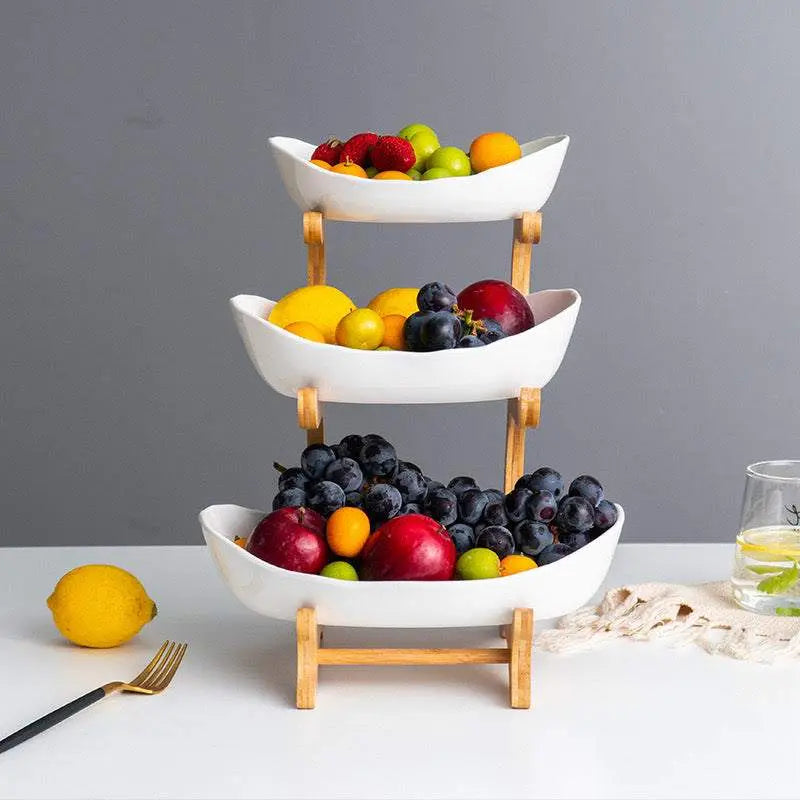 Organize your fruits and save valuable counter space with our convenient 3-layer food storage dish. The wooden frame adds a touch of elegance to your kitchen and keeps your fruits fresh and visible. Keep your kitchen clutter-free and your fruit easily accessible with this handy organizer.