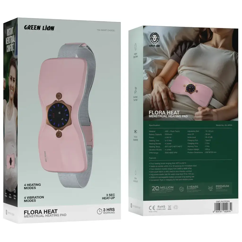 The Green Lion Flora Heat Menstrual Heating Pad is your ultimate companion during menstrual cycles, designed to deliver fast, safe, and customized cramp relief. With 3-second rapid heating and adjustable temperature levels from 50°C to 65°C, it ensures soothing warmth tailored to your comfort. Equipped with 4 vibration modes ranging from 5000 to 8000 VPM, this heating pad combines heat therapy and vibration massage to ease cramps and tension effectively. Its skin-friendly plush fabric and ergonomic adjustable belt (70–120 cm) provide a secure and comfortable fit, allowing you to relax at home, work, or while traveling. Powered by a 2500mAh rechargeable battery, the pad offers up to 3 hours of continuous use on a single charge via Type-C. The intelligent digital display makes operation simple, while the 30-minute auto shut-off ensures safety. Operating at a low noise level of 20–40 dB, it provides discreet relief anytime you need it. Stay comfortable, confident, and pain-free with this modern solution for period cramps and abdominal discomfort.