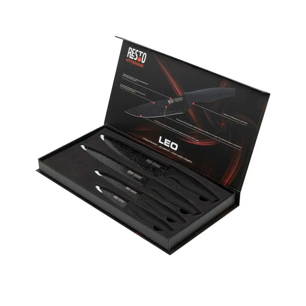 The Resto 4-piece knife set. With their long-lasting sharpness and antibacterial stainless steel blades, this set's ergonomic soft-touch handles provide comfort and convenience. This set comes with a chic magnetic gift box that makes storage and presentation simple, making it the ideal present for any home cook.