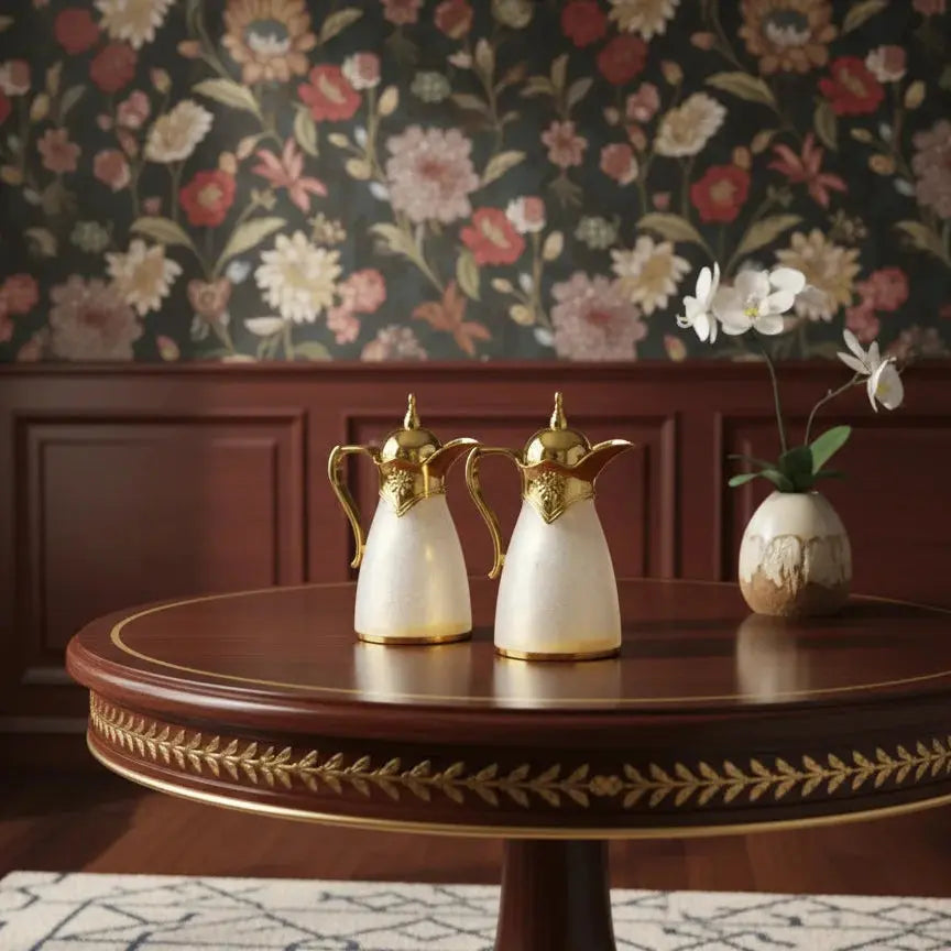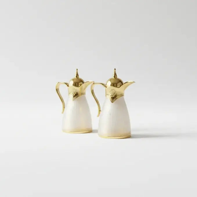 Upgrade your hospitality with this luxurious two-piece vacuum flask set, designed to combine timeless beauty with superior thermal performance. Featuring a marble white finish accented with elegant gold coating, this set brings a refined and sophisticated touch to any table setting. Each vacuum flask is crafted with a durable exterior and high-quality thermal insulation, ensuring beverages remain hot or cold for extended periods. The two different sizes offer flexibility for serving tea, coffee, or cold drinks, making the set ideal for daily use, guest hospitality, and special occasions. With a comfortable, easy-to-hold handle and a premium finish, this vacuum flask set delivers both practicality and luxury in one elegant package.